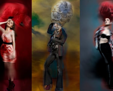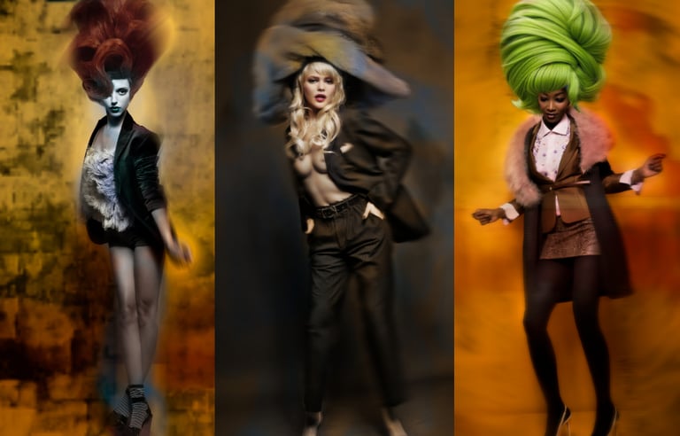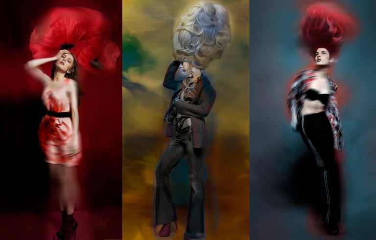 The image captures a moment where motion becomes memory. Few figures, suspended between reality and dream, surge through color and light as if the screen itself is breathing. The longer exposure blurs their forms into ribbons of vitality, revealing the energy that animates fabric, hair, and skin. I approached the scene with a hands-on, tactile method: soft key light to sculpt faces, backlight to carve edges, and deliberate color shifts—warm amber for tenderness, cool blue for mystery. The result is a surreal duet of presence and illusion, inviting viewers to step into a space where movement outpaces language and feeling takes center stage. This work is a meditation on freedom—from glossy conventions, toward a personal, dreamlike truth.